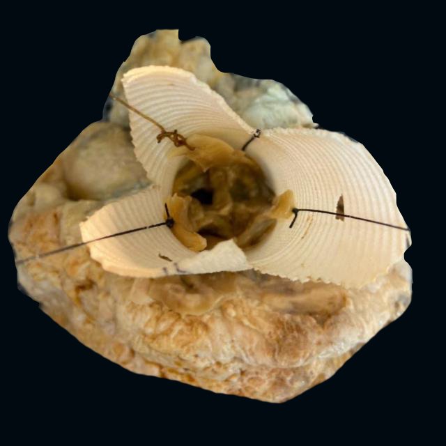 Vista de la aorta desde arriba. Se aprecia cómo se ha implantado la válvula aórtica y las comisuras DENTRO de la prótesis. Los puntos que emergen de la misma (señalados con asteriscos) traccionan de las comisuras.